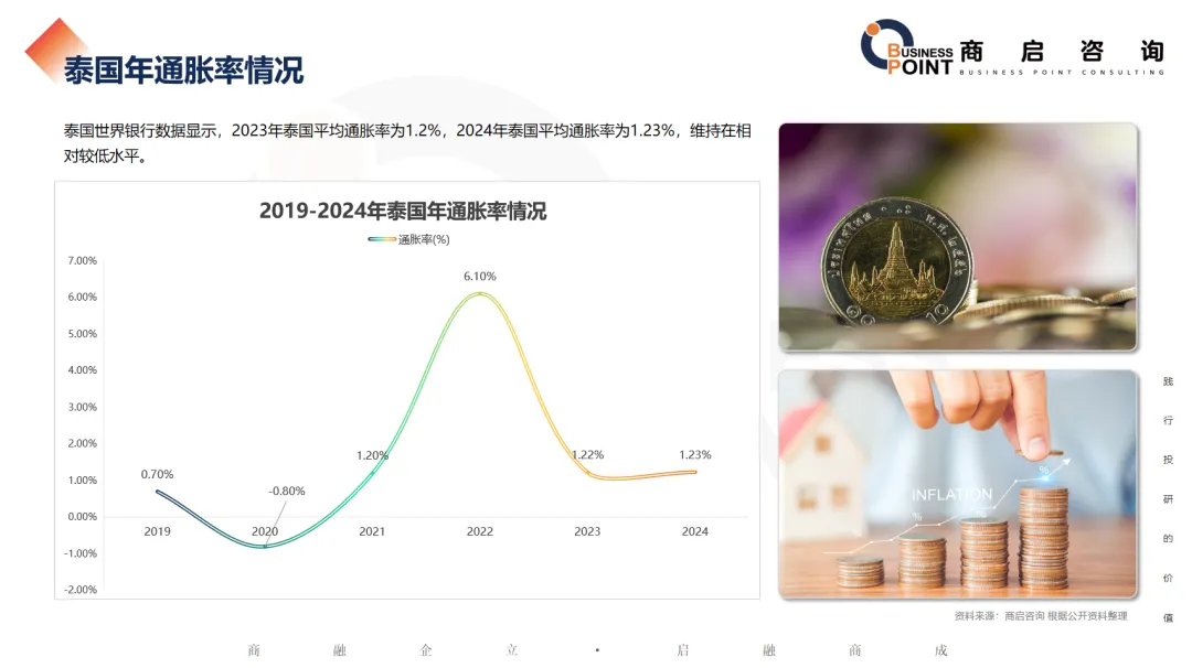 泰国世界银行数据显示,2023年泰国平均通胀率为1.2%,2024年泰国平均通胀率为1.23%,维持在相对较低水平。