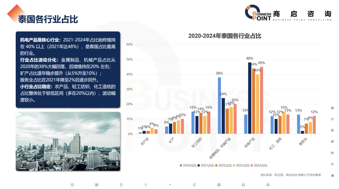 机电产品是核心行业:2021-2024年占比始终维持在 40% 以上(2021年达48%),是泰国占比最高的行业。