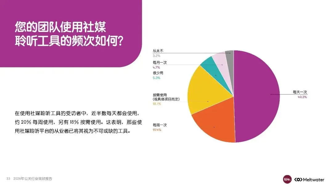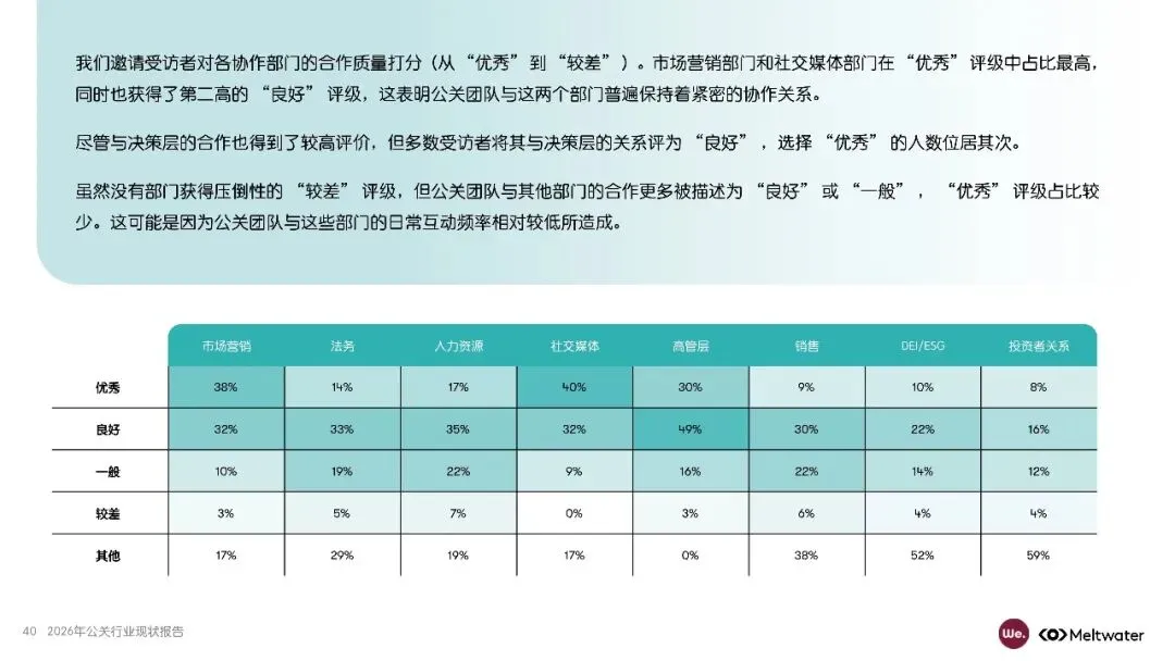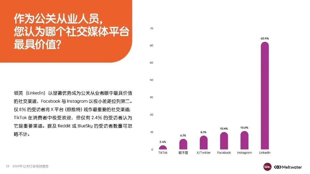 报告还强调,公关团队与企业决策层的协作日益紧密,但领导层对公关工作的了解仍需加强。社交媒体和红人营销虽重要,但未被视为核心职能。未来五年,AI整合、战略规划和数据分析能力将成为公关从业者必备技能。AI工具在内容创作、成效评估等耗时工作中可发挥更大作用,助力公关团队提升效率。此外,报告建议公关团队优化报告体系,将公关成效与业务KPI挂钩,以争取更多资源支持。