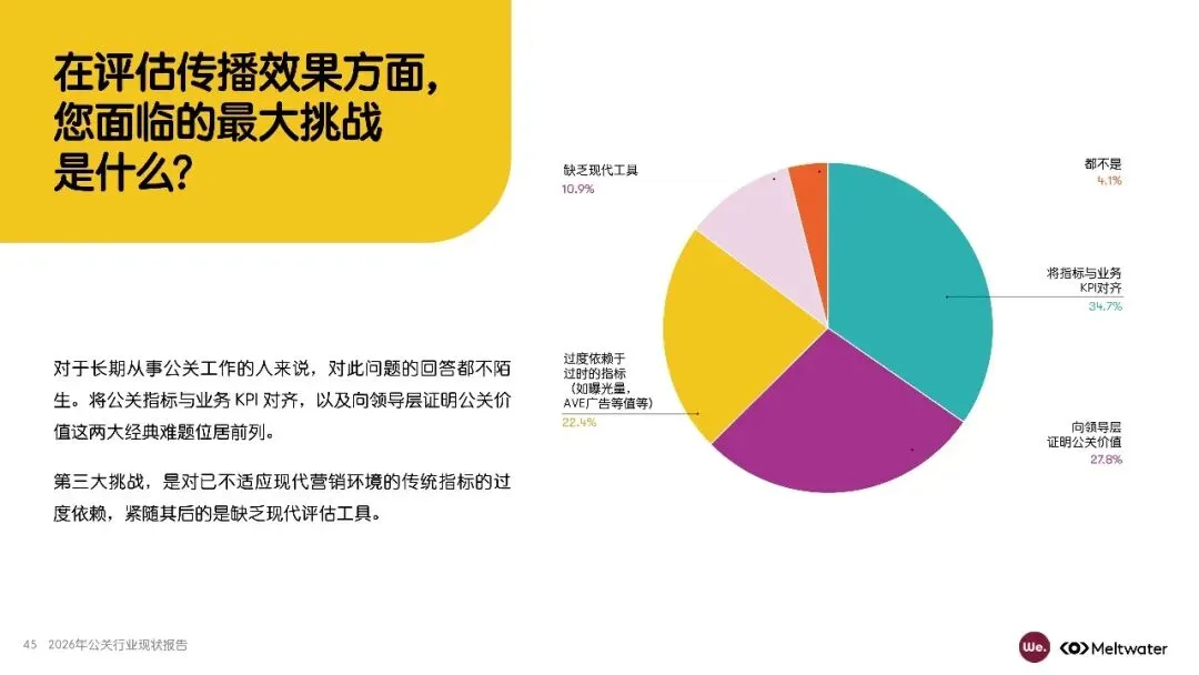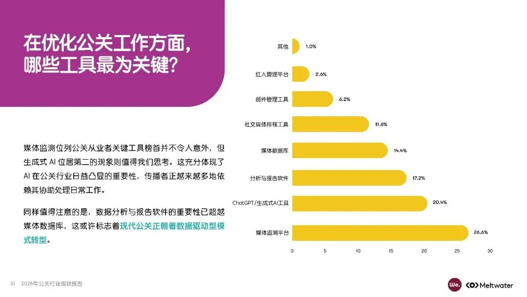 公关行业正面临技术变革、经济政治文化变迁等多重挑战,AI技术的兴起尤其对行业产生深远影响。调研显示,资源不足和衡量成效是公关从业者面临的两大核心挑战,而媒体发稿量与曝光量仍是主要评估指标。AI工具虽已广泛应用于公关工作,但仍有提升空间,从业者需系统化推动AI融入日常工作。