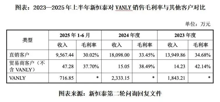 第二轮问询回复文件显示,报告期内,新恒泰主要向VANLY销售IXPE(辐照交联聚乙烯发泡材料)相关产品。尽管新恒泰未披露对VANLY的销售毛利率,但是新恒泰指出,2023年度,公司对VANLY的销售毛利率略高于其他贸易商客户、直销客户,主要系2023年VANLY刚成立,对供货量要求较大,公司考虑境外销售回款及未来经营不确定等风险,合作初期相应产品定价较高。2024年和2025年上半年,随着双方合作的稳定持续且VANLY整体采购量较大,公司对VANLY毛利率有所下降,VANLY毛利率与其他客户趋于一致。总体而言,公司对VANLY的毛利率与其他贸易商、直销客户较为接近,不存在异常差异。