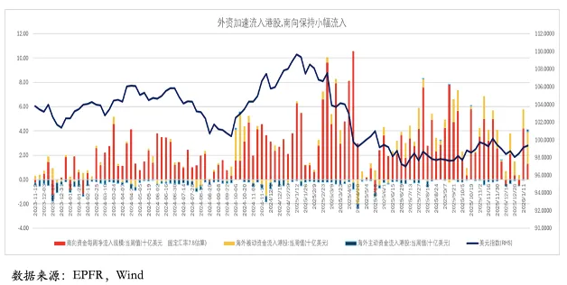 资金面看,EPFR外资净流入金额再度创24年10月以来新高,主被动外资亦是近六周周度同时净流入,南向仍保持净流入但边际放缓,不过从日度涨跌幅和南向净流入规模来观察,南向仍以跟随外资为主;此外,港股卖空占成交额比例已降至11.62%,低于近一年均值超过一倍标准差;整体看,港股微观资金面相对充裕,短期做多力量较强。