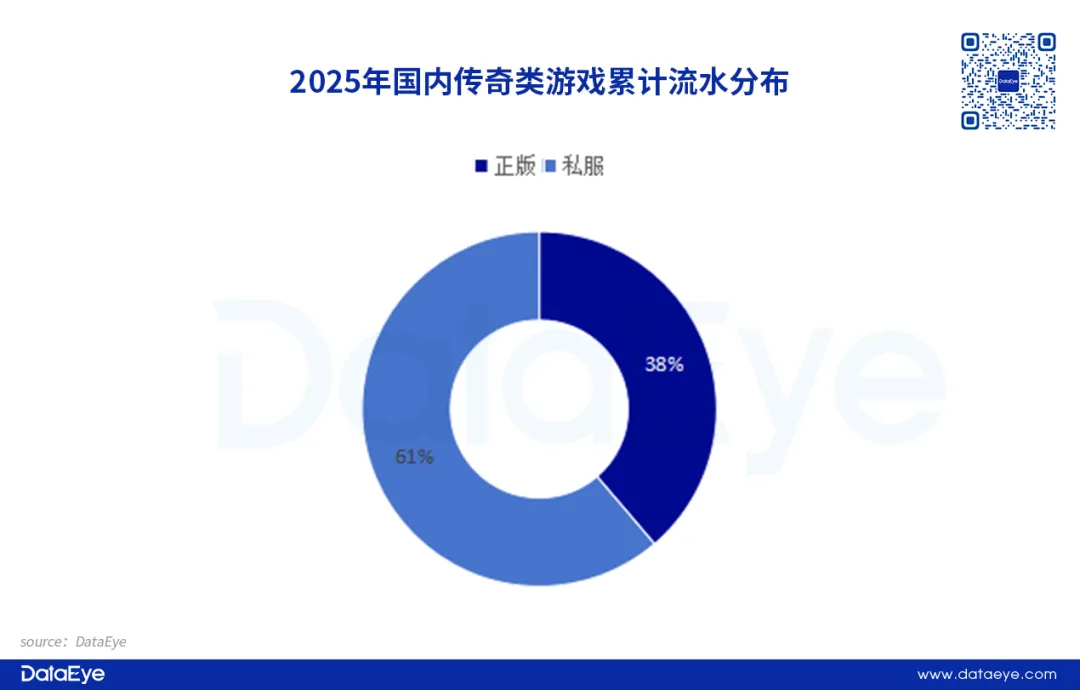 DataEye研究院根据公开数据进行测算,2025年传奇类游戏用户手游(正版 + 私服)用户规模约为5940万人,同比增长约2.5%,整体用户规模呈现持续上涨的趋势。2025年手游用户占总用户62%,是绝对的主导力量。作为传奇类游戏的主力军,传奇类手游的正版用户大幅度领先私服用户,这意味着在传奇版权合规的大趋势下,手游玩家是传奇厂商格外重视的用户群体。