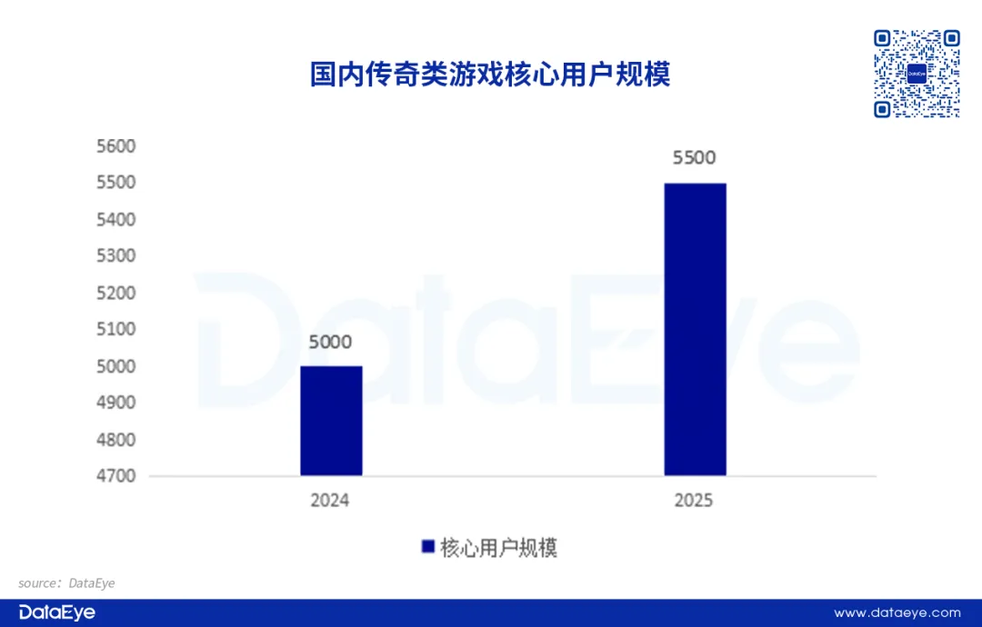 传奇游戏经过二十余年的市场沉淀,已积累了庞大的用户基数。DataEye研究院结合市场公开数据推演数据显示,2025年以行业口径的传奇游戏核心用户进一步扩大,预估核心用户会上升至5500万人。核心用户作为长期活跃、付费稳定的中坚群体,并且对传奇有深厚情感投入。