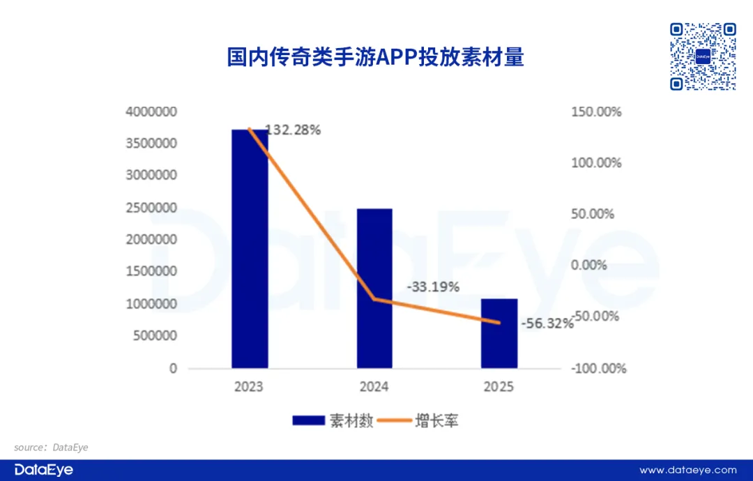 尽管传奇题材始终是游戏买量市场的重要品类,可基于市场竞争加剧,整体买量规模明显收缩。其中,传奇类手游的买量规模在2023年之后出现持续下滑的态势。根据DataEye研究院统计,2025年传奇类手游预估投放素材数108万,同比下滑56%。