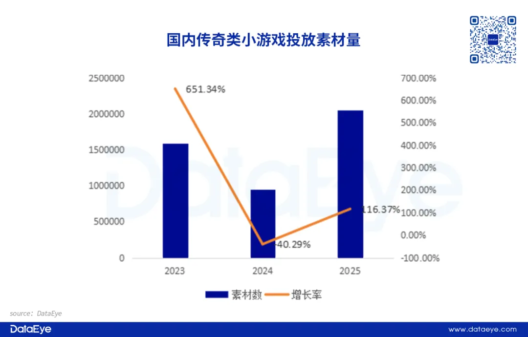 相比之下,传奇题材小游戏在经历了2024年投放素材量低谷之后,进入2025年的品类买量广告投放规模呈现出明显飙升态势。根据DataEye研究院统计,2025年传奇类小游戏投放素材量超过204万,整体投放素材量同比增长约116%。同时也超过了传奇类手游的总体投放素材量。一方面是小游戏赛道获客成本悬殊,CPA(平均用户获取成本)仅是手游端的1/6,对于依赖通过买量投放获取用户的传奇类游戏来说,投放成本优势明显;另一方面是小游戏端转化路径极短,基于小游戏无需下载、即点即玩的产品特点,传奇类小游戏触达用户效率更高,进而让整体转化率提升。