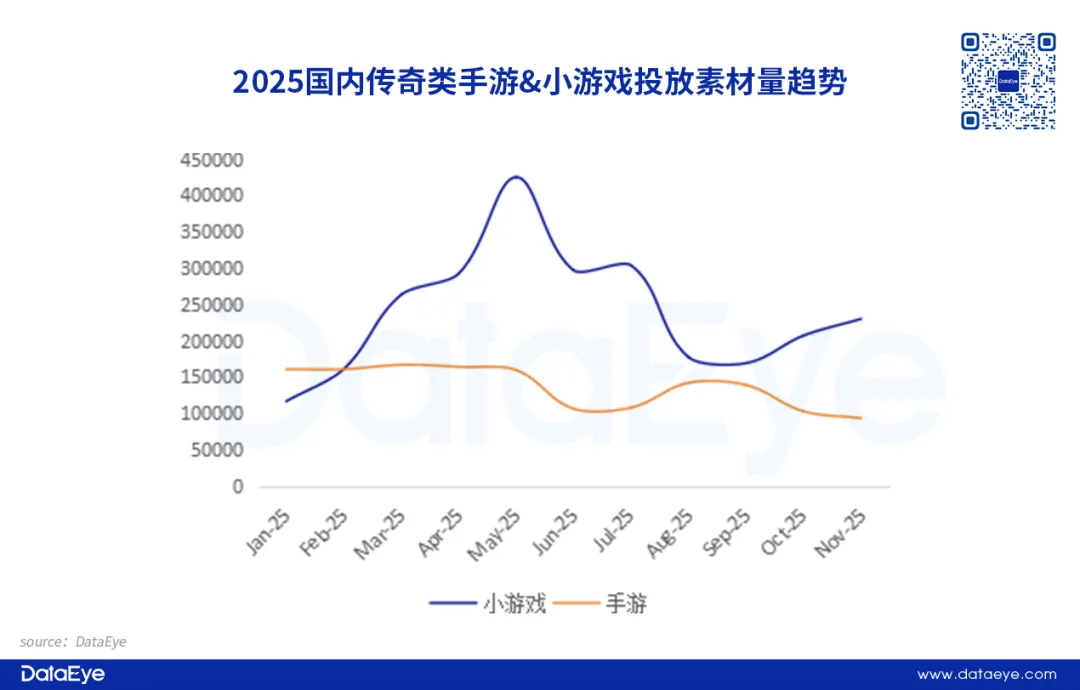 通过对传奇类游戏的投放趋势进行观察,传奇题材的投放素材格局在2025年发生较大的变化。传奇类手游买量素材量在2025年整体维持平稳,但总体投放素材量呈断崖式下滑,这反映出传奇类手游市场趋向饱和,获客难度加剧,相对来说,小游戏赛道已经成为传奇类游戏的抢量新战场,进而导致传奇小游戏投放量激增,基本上主导了传奇类游戏投放素材的整体格局。