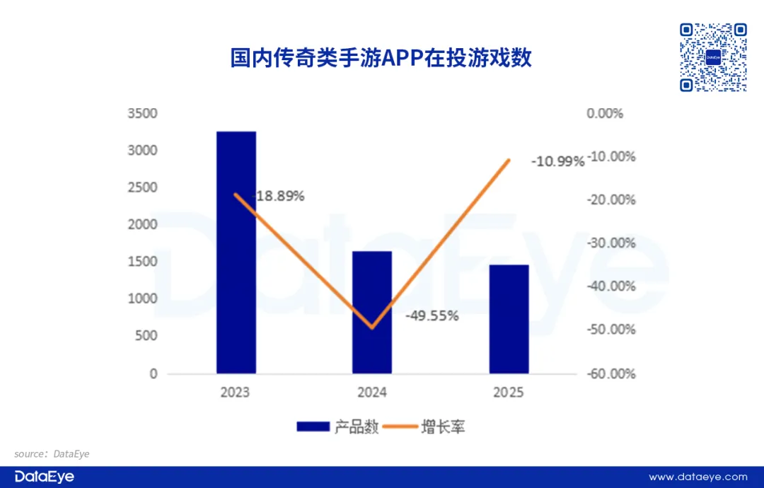 2025年传奇类手游在投游戏数呈现持续下滑的迹象,但降幅有所收窄。根据DataEye研究院统计,2025年传奇类手游在投游戏数约1450款,同比2024年下滑10%。另外,新增在投传奇类手游再创新低,全年新增在投游戏数约412款,同比下滑约34%。