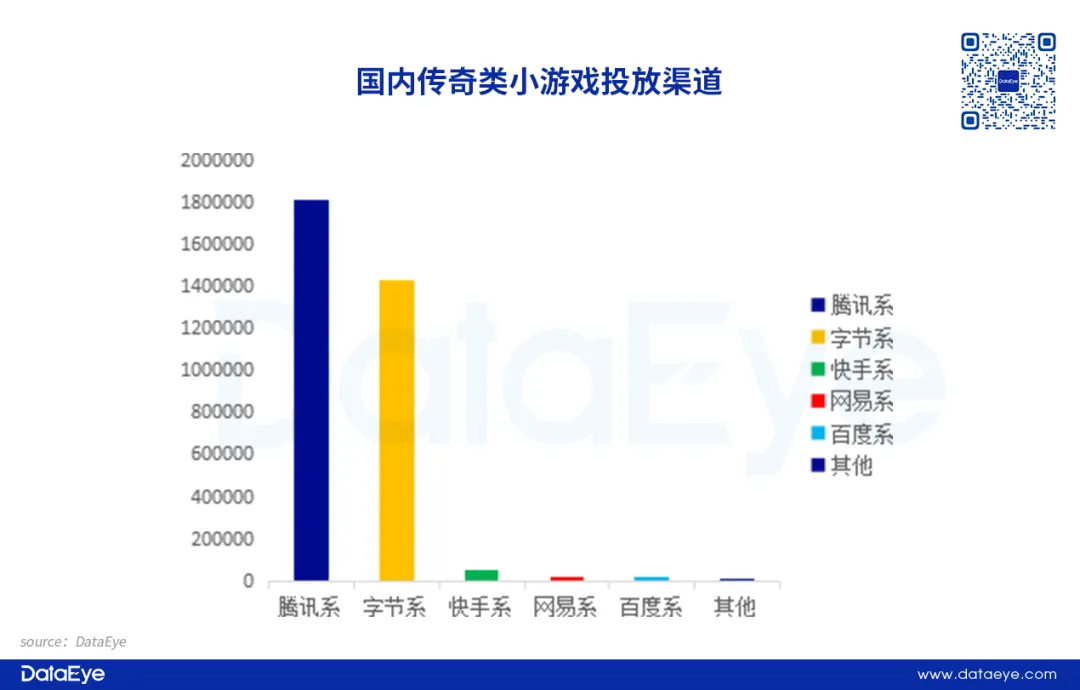 传奇类小游戏投放渠道同样呈现腾讯、字节双巨头垄断格局,形成绝对主导的二元结构,其他渠道影响力微乎其微。而在具体渠道分布上,但腾讯系占比更高,约为54%,这主要原因是在于腾讯超级APP应用+交裂变天然优势,小游戏生态闭环契合传奇游戏“碎片化 + 强社交”特性。