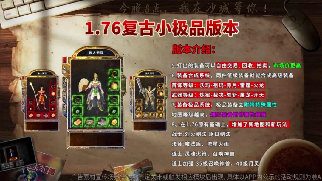 情怀怀旧类:核心围绕“青春记忆”“经典回归”,通过复刻《热血传奇》经典场景、还原“屠龙刀”“沙巴克攻城” 等元素,精准触达传奇类核心用户。例如“20 年传奇老玩家回归,再续兄弟情”“复刻 1.76 版本,无氪金无套路” 等创意,投放转化率较高。