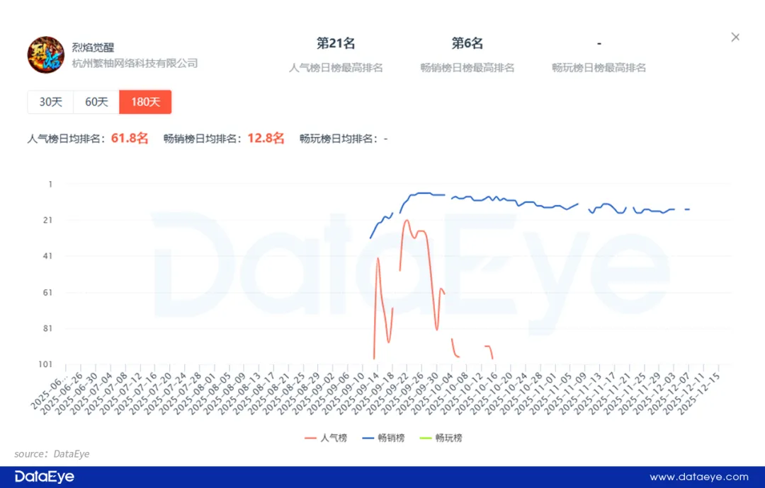 玩心不止的传奇小游戏《烈焰觉醒》在2025年9月11日正式发布,次日冲入微信小游戏畅销榜,并排名第31名。随后《烈焰觉醒》市场表现持续突出,上线不足一个月就冲入微信小游戏畅销榜TOP10,并排名第6。