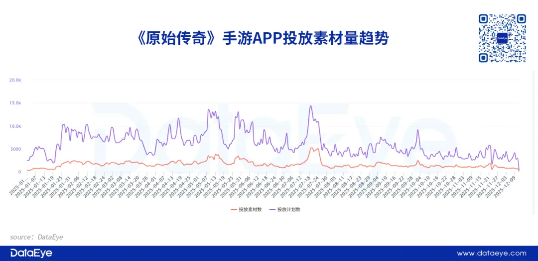 《原始传奇》在竞争激烈的传奇赛道中,买量投放依然强势。DataEye研究院统计,《原始传奇》全年投放素材超过8万组,并且在特定营销节点会增加素材投放量,保证产品的曝光度,素材内容主要是通过还原初代画面和怀旧话术精准唤醒老玩家情怀。