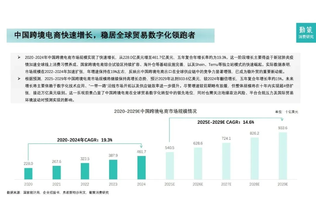 别觉得跨境电商增速放缓就没机会了。数据表明,2020 - 2024年,中国跨境电商市场规模由228亿美元跃升至461.7亿美元,五年复合增速达19.3%。勤策预测,至2029年市场规模将翻倍至933.6亿美元,几近万亿之巨。
