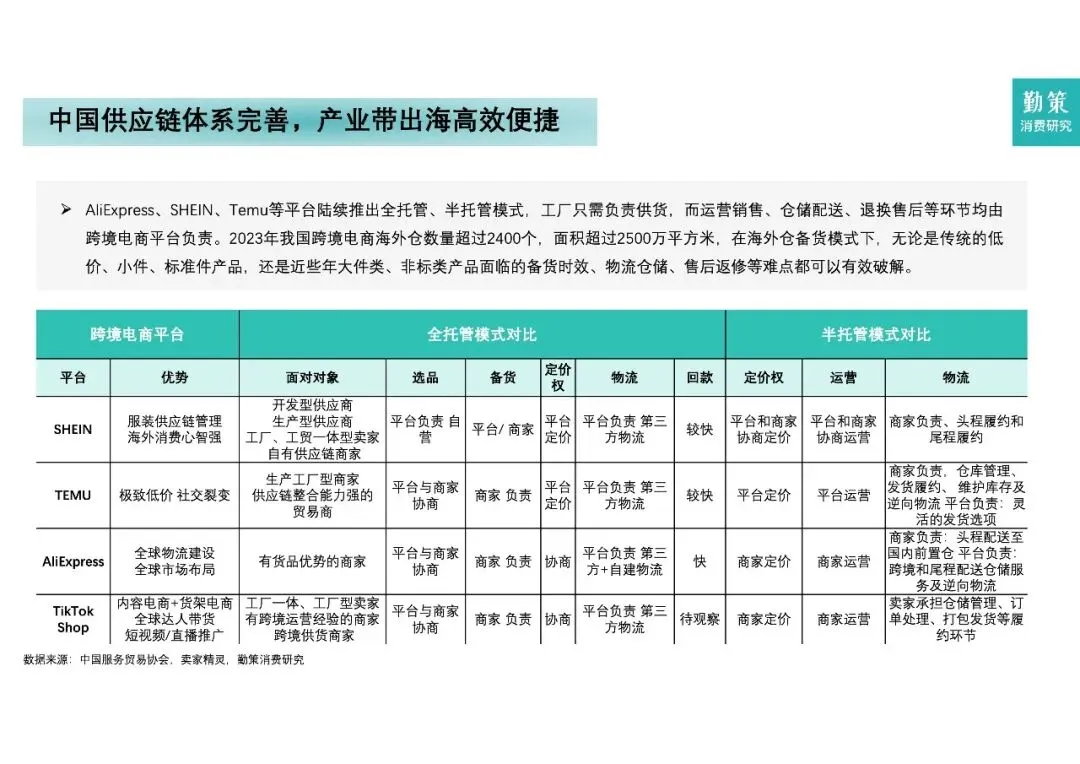 有意思的是,增长动力早不是靠低价走量策略了。一方面是政策托底,海关的9610、9710等监管模式简化了申报,2024年还取消了海外仓备案,对做外贸的企业来说,物流成本和合规门槛都降了。另一方面,SHEIN、Temu的全托管模式带火了产业带,服装、家居工厂只需供货,运营、物流全由平台包揽,出海门槛直接被拉低。
