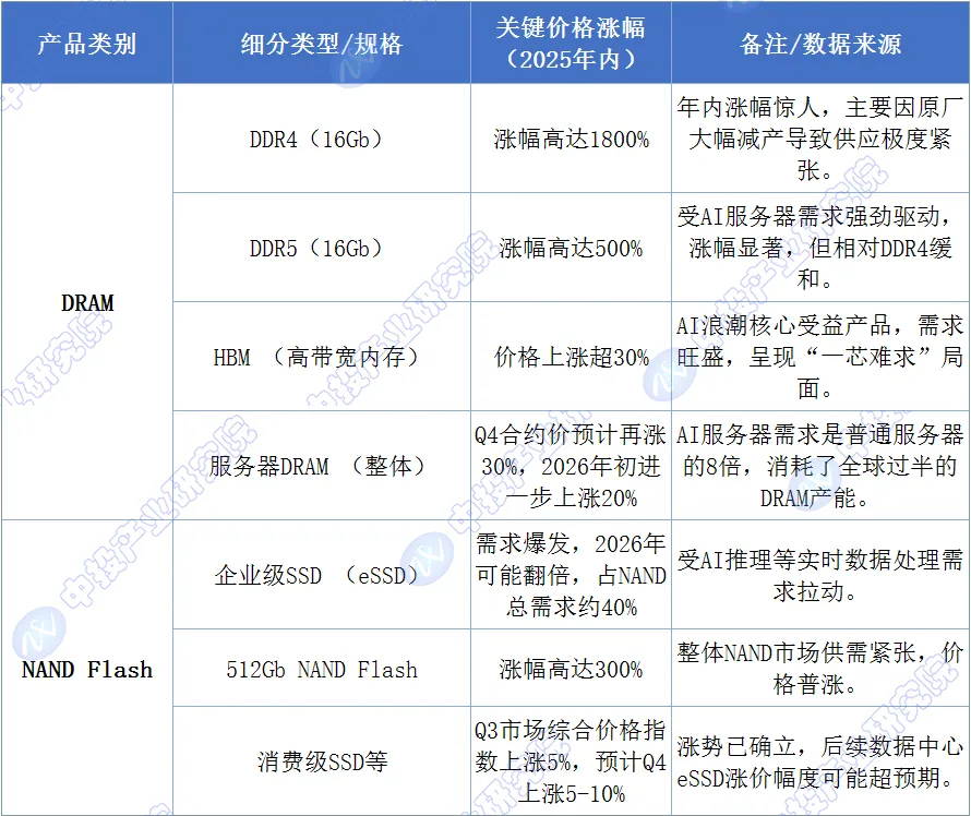这种深刻的供需矛盾直接体现在价格上,形成了“一天一个价,甚至一天几个价”的市场局面。自2025年第二季度以来,存储现货价格经历了数轮跳涨。截至2025年11月中旬的数据显示,部分DRAM现货价格较年初低点涨幅高达数倍,其中DDR4内存半年累计涨幅超200%,服务器用DDR4近一个月涨幅就达30%-70%。NAND Flash现货价格涨幅也超过100%,闪迪在11月宣布大幅调涨NAND闪存合约价格,单月涨幅高达50%。这种涨势已经导致出现“前代产品价格反超新一代”的异常现象——DDR4价格甚至比DDR5高出一倍。尽管合约价上涨通常滞后于现货价,但上涨趋势已经确立,中信证券预计合约价在2026年上半年将持续追赶现货价涨幅。