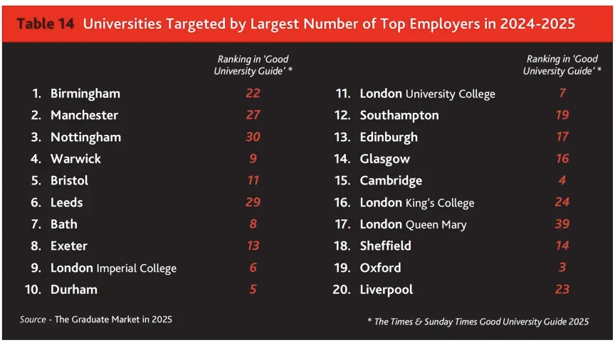 近年来,在英国顶尖雇主评估的“就业前景最佳”大学榜单上,总有一些名字令人意外:伯明翰大学成功卫冕,曼彻斯特大学、诺丁汉大学等紧随其后,而传统意义上的G5超级精英大学仅帝国理工学院上榜。