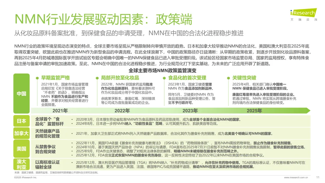 当前正处于化妆品合规落地与保健品审批受理并行的关键过渡阶段。2022年NMN已经通过化妆品新原料备案,2025年4月康盈红莓等企业的相关产品也进入了保健食品审批受理名单。结合全球合规化趋势来看,未来突破的关键离不开本土临床数据的积累,政企学研协同推进很重要,同时借鉴美国、澳大利亚等市场的合规经验,用扎实的安全性与功效性验证满足国内保健食品的审批要求,才能推动行业进一步规范化。
