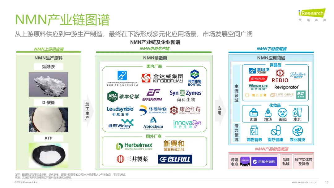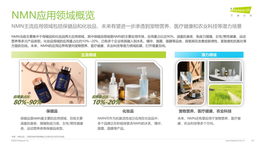 NMN作为NAD+的直接前体,凭借抗衰老、DNA修复等核心功能成为健康产业焦点。2025年全球合规化进程显著提速,美国、澳大利亚等主要市场已确认其合法地位,这股全球合规浪潮也带动国内行业发展。中国作为全球最大NMN原料生产国,目前已实现化妆品领域合规落地,2025年4月更将其列入保健食品审批受理名单,政策开放曙光初现。市场端受“银发经济”与90后“抗初老”需求双重拉动,叠加全酶法、磁酶法等技术突破降本提质,2025年市场规模预计突破30亿元,主流应用于保健品和化妆品领域,未来还有望向宠物营养、医疗健康等方向拓展,不过行业仍面临夸大宣传、消费者认知不足等挑战。