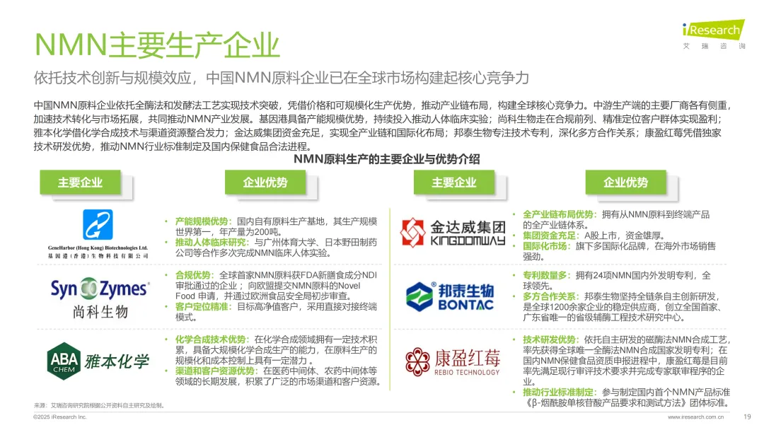 核心技术迭代始终围绕提升纯度、降低成本、减少污染的目标推进,从早期的化学合成法逐步升级到发酵法、半酶法,再到现在主流的全酶法,如今已迈向磁酶法的创新阶段。头部企业的技术路线各有侧重,康盈红莓走在前沿,首创全球唯一专利的磁酶法技术,通过一步催化合成实现零残留、高纯度,同时聚焦合规与标准制定。基因港深耕全酶法的GENAD技术,已经实现99.9%高纯度和规模化生产,年产能可达200-300吨,更侧重临床验证积累。金达威则依托全产业链优势,整合生物合成技术与品牌运营,在保障产品品质的同时,兼顾成本控制与市场覆盖,还率先完成了NMN新膳食成分的FDA合规程序,强化了全球竞争力。