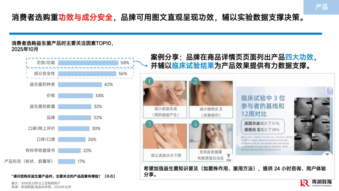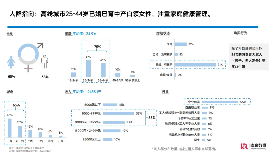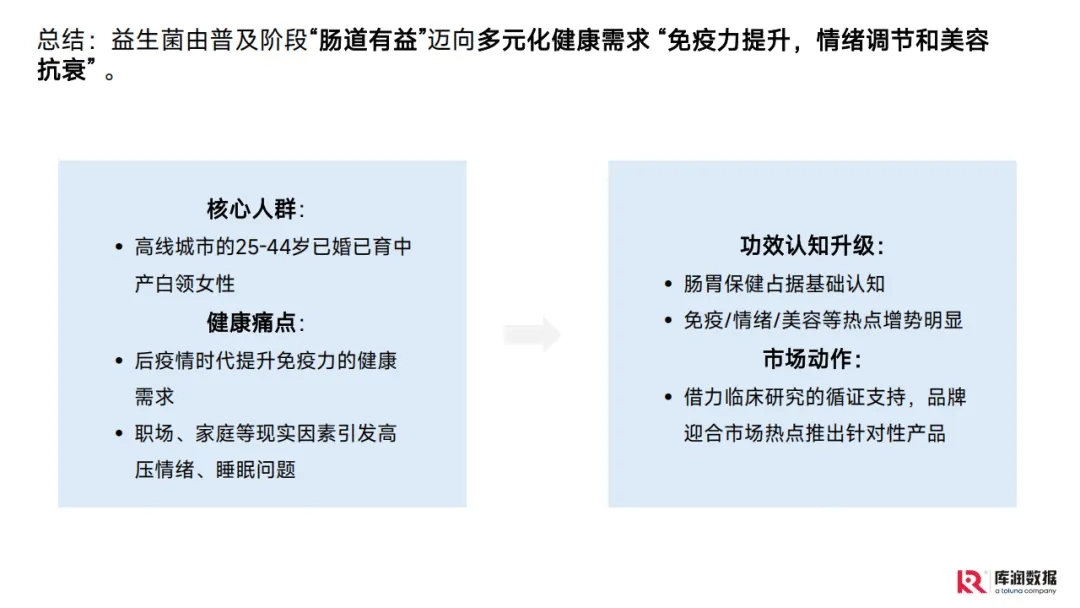 消费者方面,核心人群聚焦高线城市25-44岁已婚已育中产白领女性,平均年龄34.9岁,平均月收入12453.1元,除自我消费外,35%会为家人购买。当下消费者主要健康痛点集中在免疫力、睡眠和疲劳问题,超半数人群存在免疫力轻度低下情况,近八成能认知自身睡眠问题。益生菌功效认知已从基础的肠胃保健向多