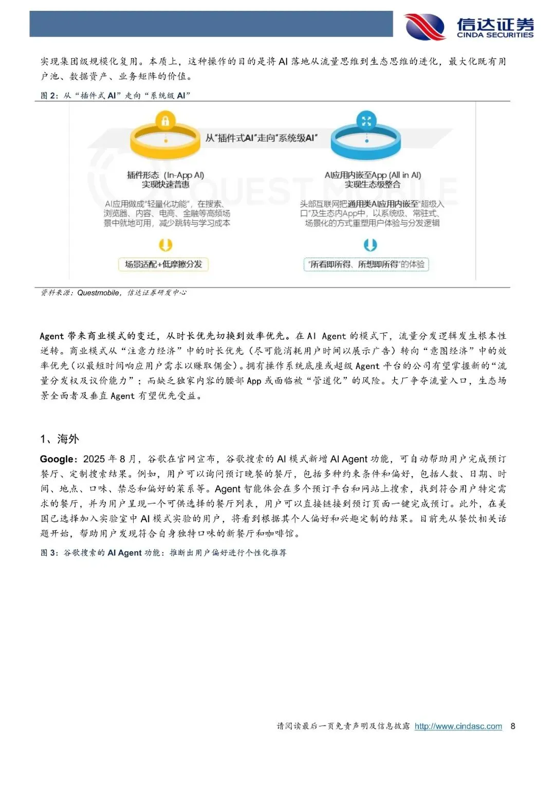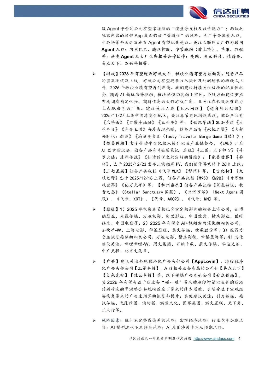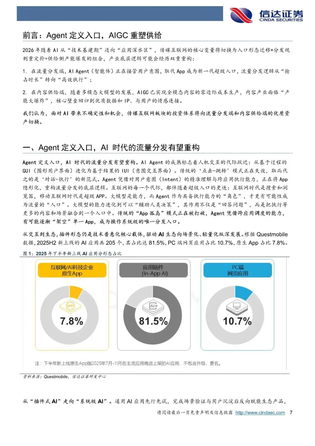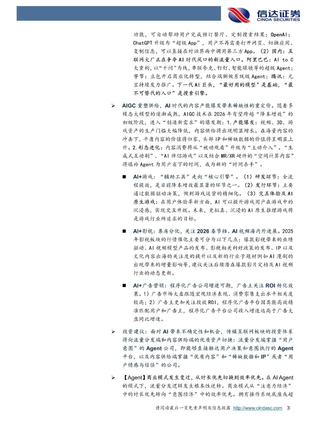 Agent 定义入口,AIGC 重塑供给。2026 年随着 AI 从“技术基建期”迈向“应用深水区”,传媒互联网的核心变量将切换为入口形态迁移+分发规则重定价+供给侧产能爆发的组合,产业底层逻辑可能会经历双重重构:1.在流量分发端,AI Agent(智能体)正在接管用户意图,取代App 成为新一代超级入口,流量分发逻辑从“抢占时长”转向“高效执行”2.在内容供给端,随着多模态大模型的发展,AIGC 已实现全模态内容的零边际成本生产,内容产业面临“产能大爆炸”,核心壁垒回归到优质数据和 IP、与用户的情感连接。我们认为,面对 AI 带来不确定性和机会,传媒互联网板块的投资体系将向流量分发端和内容供给端的优质资产切换。回复暗号:传媒行业2026年度策略报告:Agent定义入口,AIGC重塑供给——AI时代的流量分发重构与内容产能爆发-260109-信达证券-45页免责声明:以上报告均系本报告通过公开、合法渠道获得,报告版权归原撰写/发布机构所有,如有侵权,请联系作者删除,本报告为推荐阅读,仅供参考学习,不构成投资建议,如对报告内容存疑,请与撰写/发布机构联系。