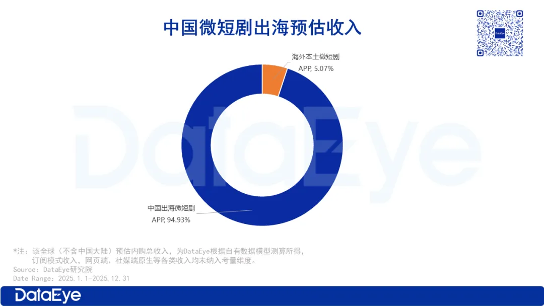 据DataEye研究院预估,2025年中国出海微短剧APP预估双端内购收入约21.63亿美元,在全球市场中占比约94.93%。