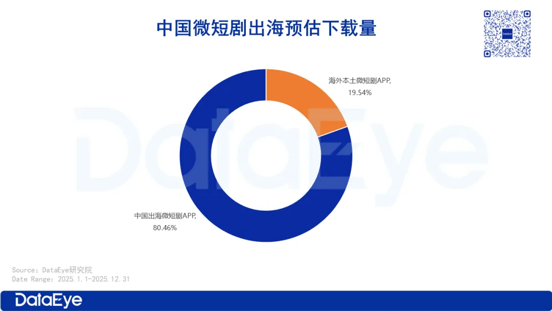 据DataEye研究院预估,2025年中国出海微短剧APP预估双端下载量达14.93亿次,在全球市场中占比高达 80.46%。