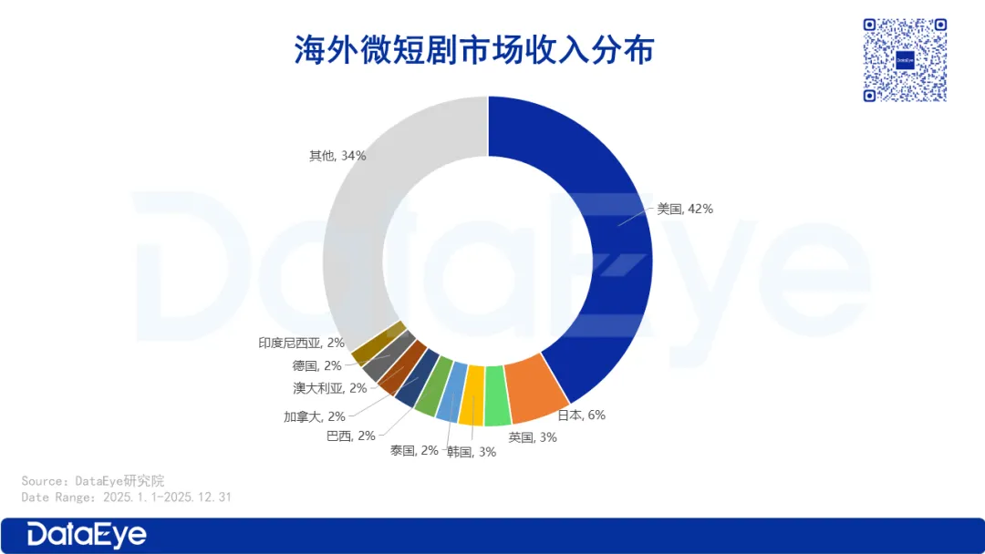 分国家来看,美国、日本、英国三大市场包揽2025年海外微短剧APP内购收入前三名,合计贡献超50%份额。