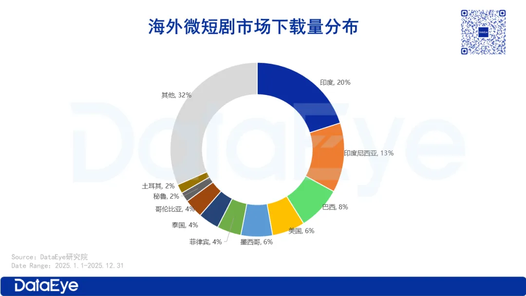 分国家来看,印度、印尼、巴西三大市场包揽2025年海外微短剧下载量前三,合计贡献超40%的总下载量。
