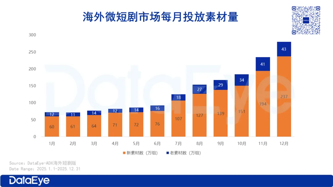 2025年,海外微短剧市场广告投放热度居高不下,全年累计投放广告素材数达1395.7万组。