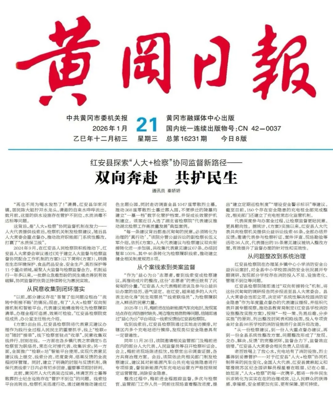 “从一份检察建议,到一份人大重点督办建议,再到一份全县系统性整改方案,问题整改形成了‘发现、交办、解决、反馈’的完整闭环,监督合力下,监督效应倍增。”红安县人大常委会相关负责人总结道。