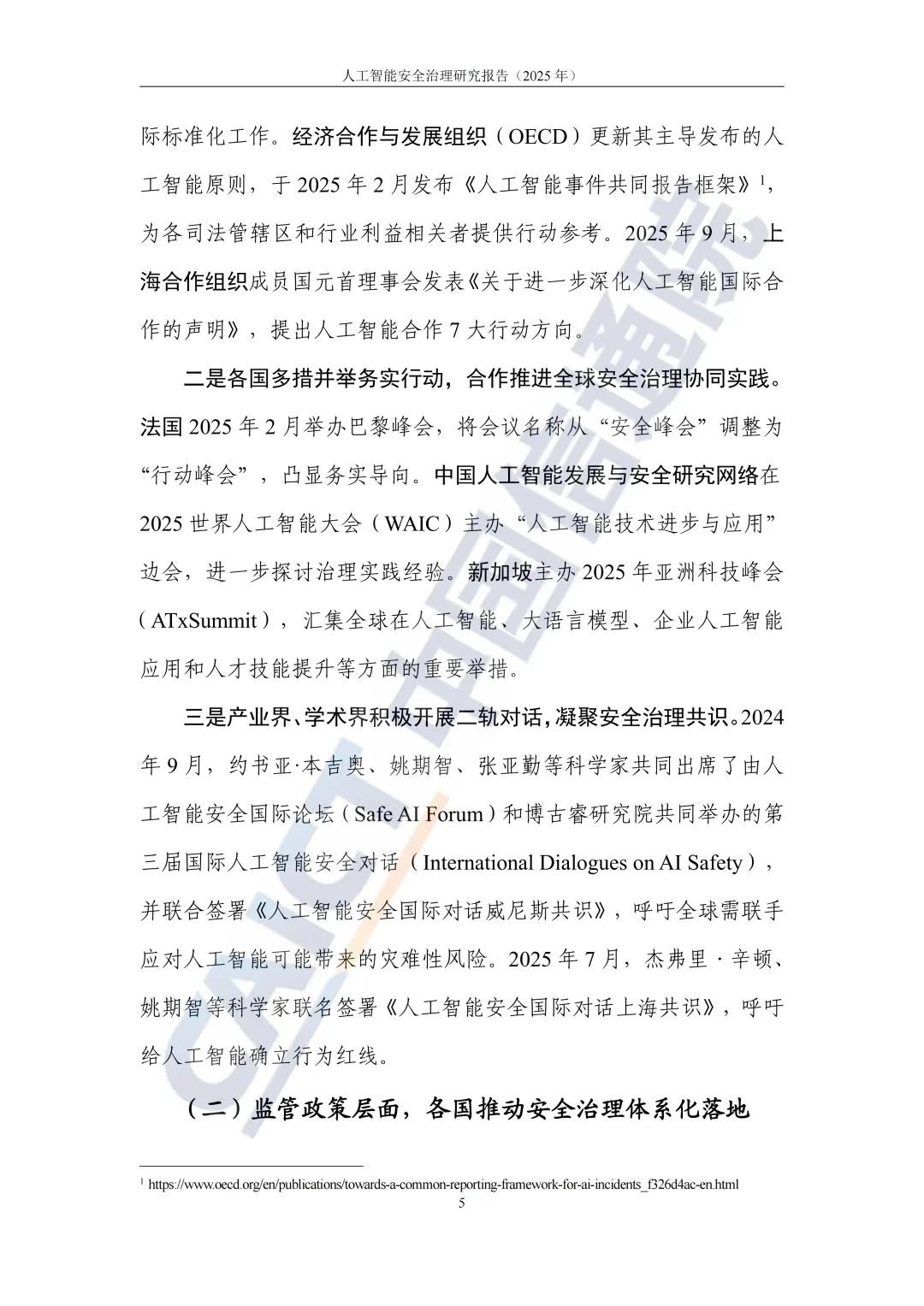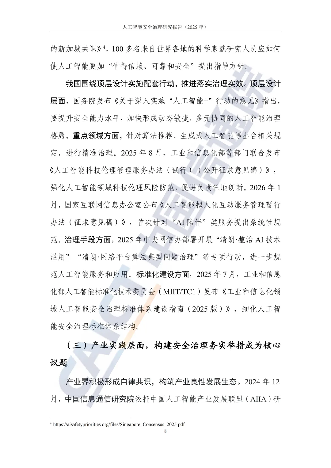 报告深入分析全球人工智能安全治理逐步迈向体系化、实操化趋势,认识到各主要经济体持续推进治理框架落地,如何在产业层面构建务实有效的安全治理举措已成为各方关注的核心议题。
