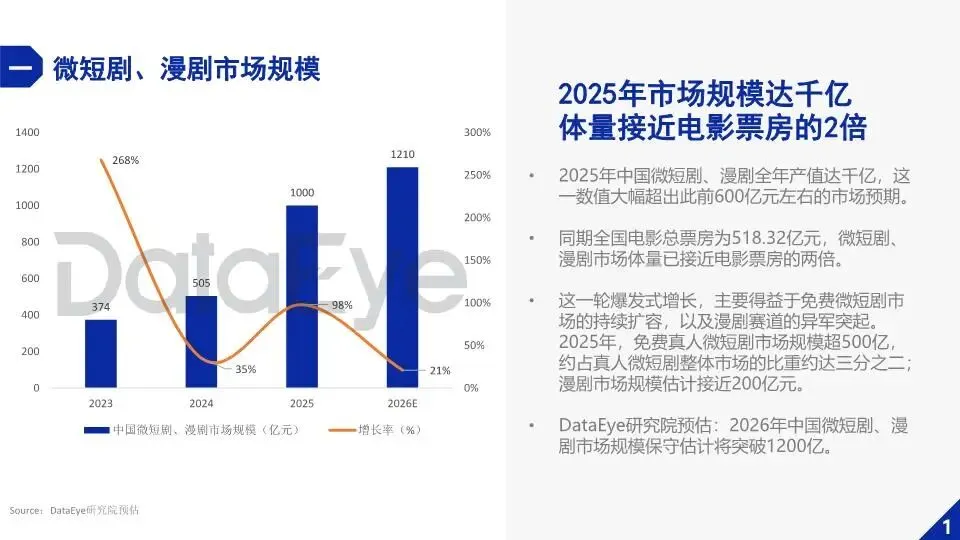 2025 年中国微短剧和漫剧的全年产值冲到了千亿级别,这个数字远超之前 600 亿元的市场预期,还接近全国电影总票房的两倍。这波爆发主要靠免费微短剧的扩容和漫剧的崛起,2025 年免费真人微短剧市场规模超 500 亿,占了真人微短剧市场的三分之二。