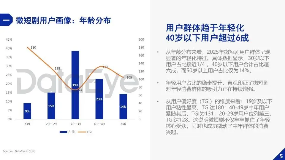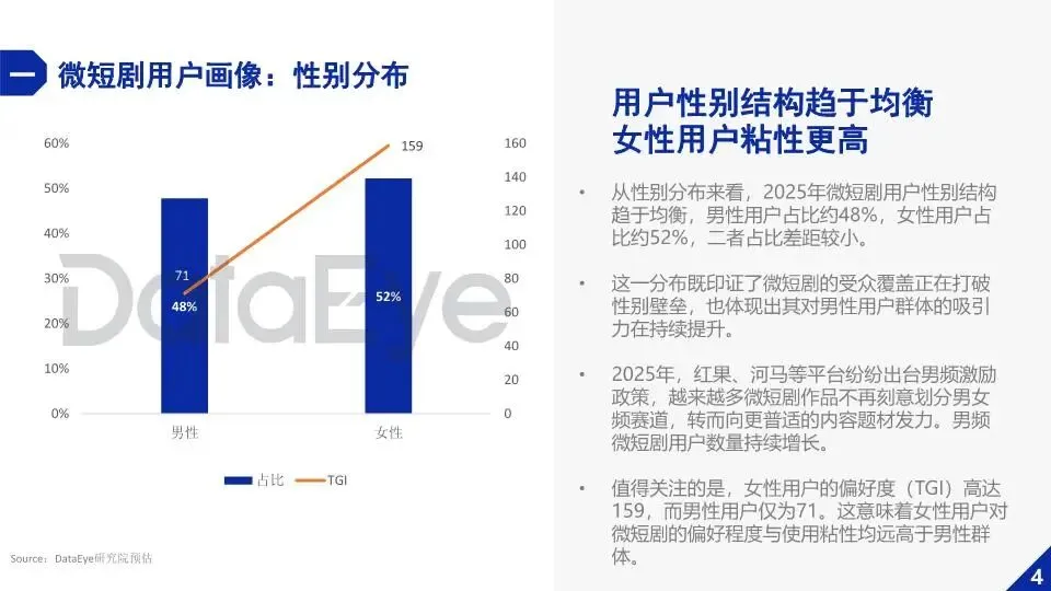 截至 2025 年 6 月,全国微短剧用户有 6.96 亿,快占到网民总数的七成。用户里女性占 52%,男性占 48%,性别分布越来越均衡,但女性对微短剧的偏好和粘性远高于男性。40 岁以下用户超六成,19 岁及以下用户的粘性最高,年轻群体和中年群体都很买账。