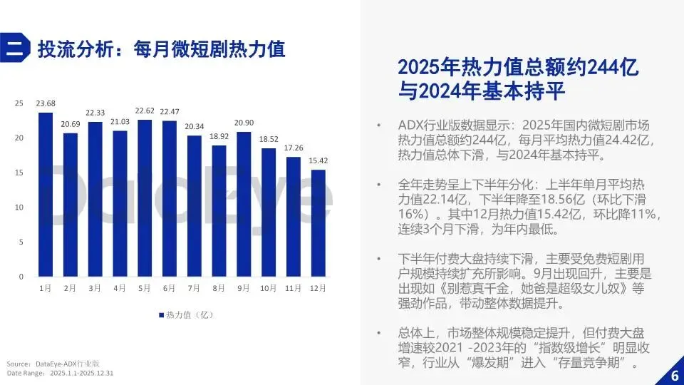 投流数据显示,2025 年微短剧热力值总额约 244 亿,逆袭题材是绝对核心,热力值达 143.9 亿。番茄、河马、麦芽三大平台贡献了六成热力值,头部效应明显。新剧占比超八成,但爆款很稀缺,百强剧贡献了 14.56% 的热力值。抖音端原生微短剧表现亮眼,月度播放增量最高超 2100 亿,逆袭、现言甜宠题材最受欢迎。