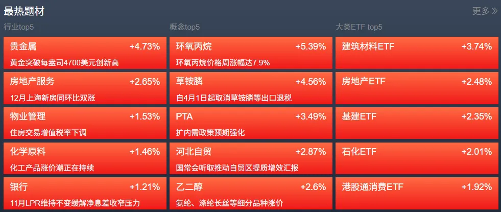 海外市场普跌,拖累A股调整。结构上看,机构称化工行业正处于产能及库存周期双拐点,有望进入上行期,是化工链普涨的主要原因之一;其中,环氧丙烷价格本月累计上涨近10%,刺激相关概念逆市大涨。