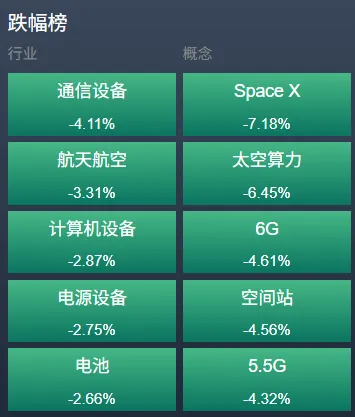 市场热点分化,化工产业链领涨,环氧丙烷、草铵膦、PTA等板块涨幅居前,贵金属、房地产服务等板块亦表现较强,银行股逆市普涨;商业航天赛道延续调整,SpaceX概念、太空算力等板块跌幅居前。