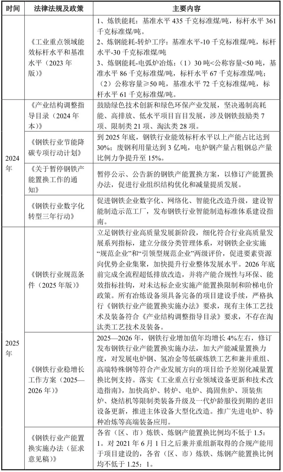 2024 年 5 月 29 日,国务院在《2024-2025 年节能降碳行动方案》针对钢铁行业发展提出加强钢铁产能产量调控、深入调整钢铁产品结构、加快钢铁行业节能降碳改造等要求。方案要求严格落实钢铁产能置换,严禁以机械加工、铸造、铁合金等名义新增钢铁产能;大力发展高性能特种钢等高端钢铁产品,严控低附加值基础原材料产品出口;加快钢铁行业节能降碳改造,推进高炉炉顶煤气、焦炉煤气余热、低品位余热综合利用,推广铁水一罐到底、铸坯热装热送等工序衔接技术。方案要求到2025 年底,钢铁行业能效标杆水平以上产能占比达到 30%,能效基准水平以下产能完成技术改造或淘汰退出,全国 80%以上钢铁产能完成超低排放改造;与2023 年相比,吨钢综合能耗降低 2%左右,余热余压余能自发电率提高 3 个百分点以上。2024-2025 年,钢铁行业节能降碳改造形成节能量约2,000 万吨标准煤、减排二氧化碳约 5,300 万吨。