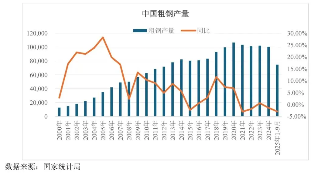 2020 年以来,中国生铁、粗钢产量整体呈现下降趋势。根据国家统计局数据, 2020 年,我国粗钢产量达到 106,476.68 万吨,生铁产量 88,897.61 万吨。 2021 年,我国粗钢产量达到 103,524.26 万吨,同比下降 2.77%;生铁产量86,856.78 万吨,同比下降 2.30%。2022 年,我国粗钢产量达到 101,795.90 万吨,同比下降1.67%;生铁产量 86,382.78 万吨,同比下降-0.55%。2023 年,我国粗钢产量为102,885.97 万吨,同比增长 1.07%;生铁产量 87,210.79 万吨,同比增长 0.96%。2024 年,全国累计生产粗钢100,509.10 万吨,同比下降2.31%;生铁产量85,173.70万吨,同比下降2.34%,实现了产量下降的预期目标。国家统计局数据显示, 2025 年1-9 月全国粗钢产量7.46 亿吨,同比下降2.9%。
