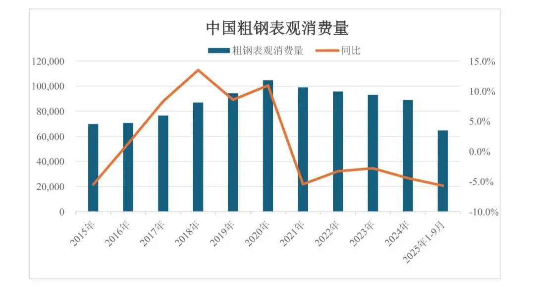 2022 年全国粗钢表观消费量为 9.60 亿吨,同比下降 3.23%。2023 年全国粗钢表观消费量9.33 亿吨,同比下降 2.8%。2024 年粗钢表观消费量8.92 亿吨,同比下降5.4%。2025 年 1-9 月,粗钢表观消费量 6.47 亿吨,同比下降5.68%。