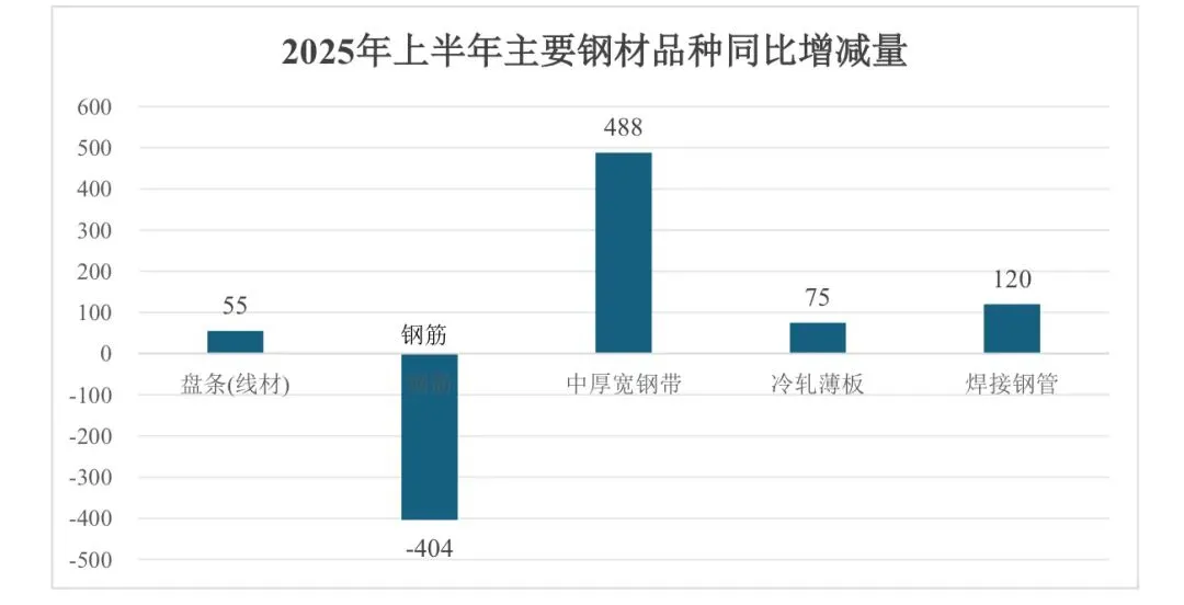 面对全球经济放缓与房地产行业下滑带来的供给过剩和需求乏力,政府通过政策调控淘汰落后产能,并支持新兴领域发展和出口经济,推动行业寻求新突破。随着中国经济转型,钢材消费总量在下降过程中,钢材消费结构也面临着深度调整。建筑用钢占比已经从 2020 年的 58%下降到 2024 年的 50%,制造业用钢则从 2020 年的 42%上升至 2024 年的 50%。制造业用钢占比首次接近建筑业用钢比重,2025 年上半年占比已超 51%,后续还会继续增加,并持续向高性能、高附加值方向转型。