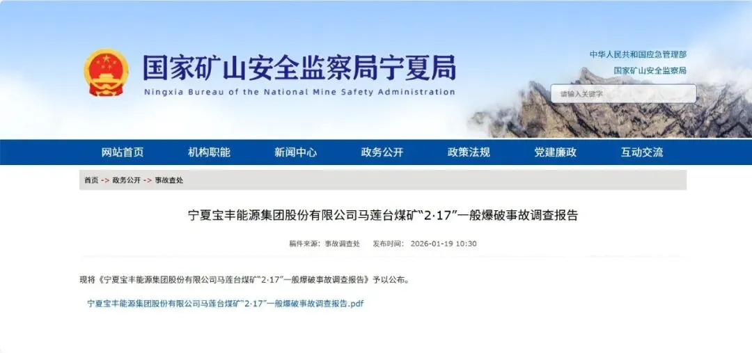 国家矿山安全监察局宁夏局1月19日公布《宁夏宝丰能源集团股份有限公司马莲台煤矿“2·17”一般爆破事故调查报告》。