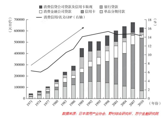 二战失败后的日本,在1945年后的30年内,经济得到了快速的发展,特别是在1960-1975年间,GDP增速长期保持在15%以上。收入、财富的增长带动消费需求的增长,以汽车、冰箱、电视、洗衣机为对象的消费需求催生了消费金融的大扩张。90%以上的汽车分销商提供分期付款的业务,松下、东芝等流通业巨头纷纷设立消金部门,中小企业则和“信贩公司”合作设立商业企业协会统一经营消费金融。期间,市场出现大量的“个人借贷公司”。据统计,在20世纪70年代末,日本有超过20万家经营消金业务的公司,其中90%以上是“个人公司”。标志性的小额消费贷巨头武富士(Takefuji)公司在此期间成立并快速崛起。