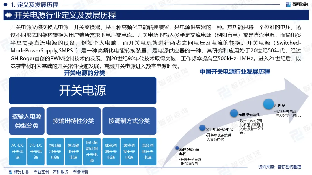 行业发展阶段:开关电源(Switched-ModePowerSupply,SMPS)是一种高频化电能转换装置,是电源供应器的一种。其研究和应用始于20世纪50年代,经过GH.Roger首创的PWM控制技术的发展,到20世纪90年代技术取得突破,工作频率提高至500kHz-1MHz。进入21世纪后,以宽禁带材料为基础的开关器件快速发展,高频开关电源进入数字电源时代。