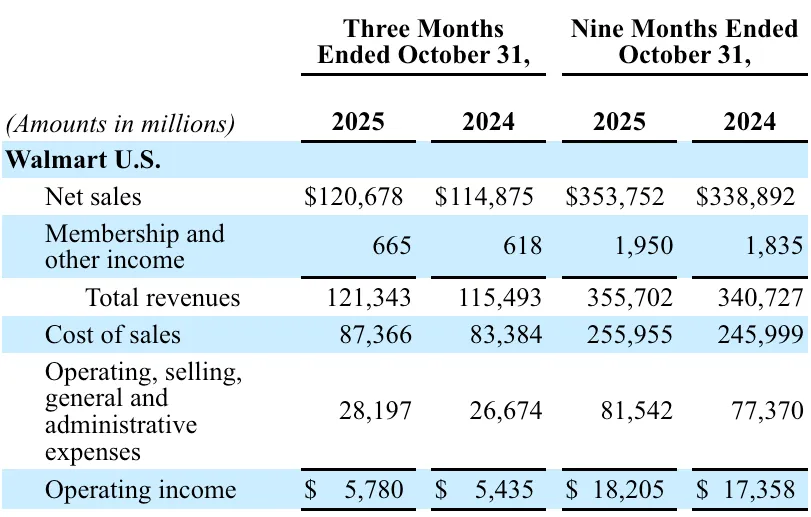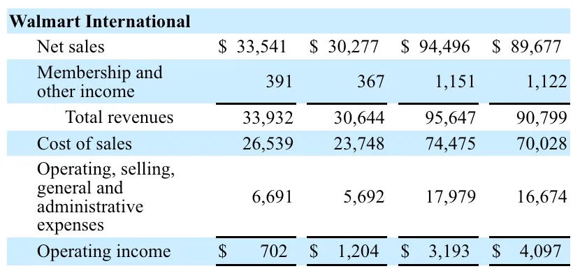 Based on the financial table provided, here is an analysis of how Walmart performed for the quarter (three months) and the year-to-date (nine months) ending October 31, 2025, compared to the previous year.根据所提供的财务数据,以下是对截至2025年10月31日的季度(三个月)及年初至今(九个月)业绩与上年同期的对比分析。1. The "Big Picture" (Consolidated Results)一、整体概况(合并结果)While Walmart’s total sales are growing, their actual profit from operations is slightly shrinking.尽管总销售额持续增长,但其实际经营利润却略有下滑。Total Revenue Growth: Up $9.9 billion (+5.8%) for the quarter.总收入增长:本季度增加99亿美元(+5.8%)。Operating Income Trend: Even though they sold more, their operating profit actually dropped by $12 million (-0.2%) for the quarter.经营利润趋势:尽管销量上升,本季度经营利润反而下降了1200万美元(-0.2%)。Why? The massive growth in the U.S. was offset by a very tough quarter for the International business and higher corporate costs.原因何在?美国本土业务的强劲增长,被国际业务的艰难表现及总部管理成本上升所抵消。2. Segment Breakdown (The "Winner" vs. The "Struggler")二、分部表现(“优等生”与“困难户”)Walmart U.S. (The Powerhouse)美国本土业务(核心引擎)This is the strongest part of the business. They managed to grow their profit faster than their sales, which usually means they are managing costs well or selling higher-margin items.这是公司最强势的板块。其利润增速超过收入增速,通常意味着成本控制得当或高毛利商品销售占比提升。Revenue: $121.3 Billion (Up 5.1%)收入:1213亿美元(同比增长5.1%)Operating Profit: $5.78 Billion (Up 6.3%)经营利润:57.8亿美元(同比增长6.3%)Operating Margin: 4.76% (Calculated as: )经营利润率:4.76%Walmart International (The Concern)国际业务(主要隐忧)This segment had a difficult quarter. While they brought in significantly more money (sales were up 10.7%), their profit crashed.该板块本季度表现艰难。尽管收入大幅增长(+10.7%),利润却急剧下滑。Operating Profit: Dropped from $1.2 Billion to $702 Million (a 41.7% decrease).经营利润:从120亿美元降至70.2亿美元(降幅达41.7%)。Operating Margin: Fell to 2.07% (compared to 3.93% last year).经营利润率:降至2.07%(上年为3.93%)。What this means: For every $100 in sales, International only kept about $2 in profit this year, whereas they kept almost $4 last year. This suggests their costs (like labor, shipping, or goods) rose much faster than their prices.这意味着:每100美元销售额中,国际业务今年仅留存约2美元利润,而去年接近4美元。表明其成本(如人力、物流或商品采购)涨幅远超售价提升。Sam’s Club U.S. (Steady & Reliable)山姆会员店美国业务(稳健可靠)Sam’s Club is showing very consistent, stable growth.山姆会员店展现出高度稳定、持续的增长态势。Operating Profit: Up 5.8% for the quarter.经营利润:本季度增长5.8%。Operating Margin: 2.77% (Calculated as: ). This is lower than Walmart U.S. because Sam's Club relies on high-volume, low-markup sales and membership fees.经营利润率:2.77%。低于美国本土超市,因其商业模式依赖高销量、低毛利商品及会员费收入。3.Summary Analysis三、综合研判If you were the "CODM" (the boss) mentioned in your previous question, your focus right now would be on Walmart International. You would be asking why profits dropped by nearly 42% even though sales were booming. You would likely be "allocating resources" to figure out if that segment has a spending problem or if international competition is forcing them to lower prices too much.若您是此前问题中提到的“首席运营决策者”,当前关注重点应放在国际业务上。您会追问:为何在销售额大幅增长的同时,利润却暴跌近42%?很可能会重新调配资源,排查该板块是否存在成本失控,或是否因海外市场竞争激烈而被迫过度降价。Meanwhile, you would be very happy with Walmart U.S., as it is providing the bulk of the company's cash flow ($18.2 billion in profit so far this year).与此同时,您会对美国本土业务感到非常满意——它正贡献公司绝大部分现金流(今年迄今已实现182亿美元利润)。For more insightful content, long press the QR code to follow 更多深度好文长按关注