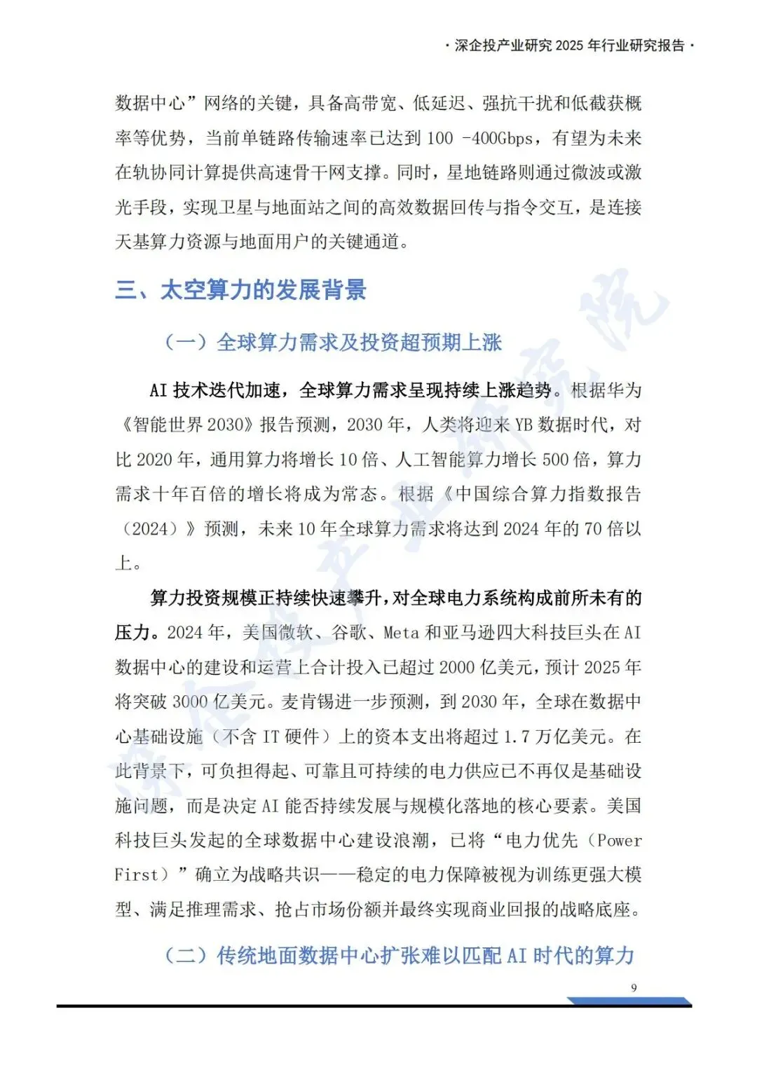 AI技术迭代加速推动全球算力需求超预期上涨。根据预测,2030年通用算力将增长10倍、AI算力增长500倍,未来10年全球算力需求将达到2024年的70倍以上。四大科技巨头在AI数据中心上的投入已超过2000亿美元,预计2025年将突破3000亿美元。