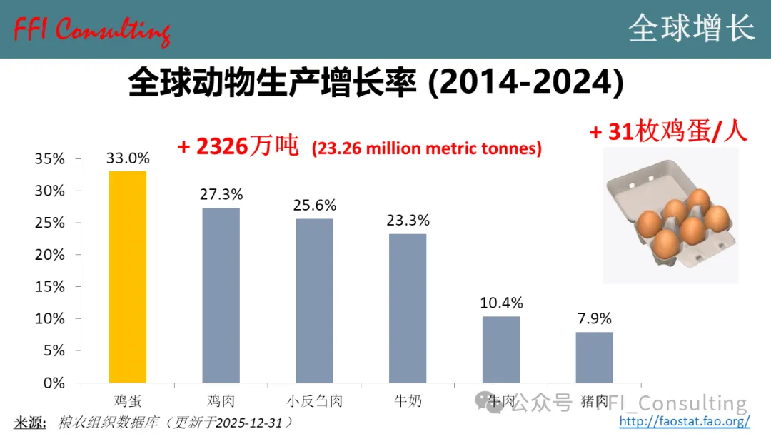 2014年至2024年间,全球鸡蛋行业增长了33%,略高于鸡肉行业的增速。产量增加意味着,到2024年,人均鸡蛋消费量将比2014年增加31枚。在此,我们向世界各地的养蛋户表示祝贺,并衷心感谢他们辛勤耕耘,为我们生产出更多美味的鸡蛋。