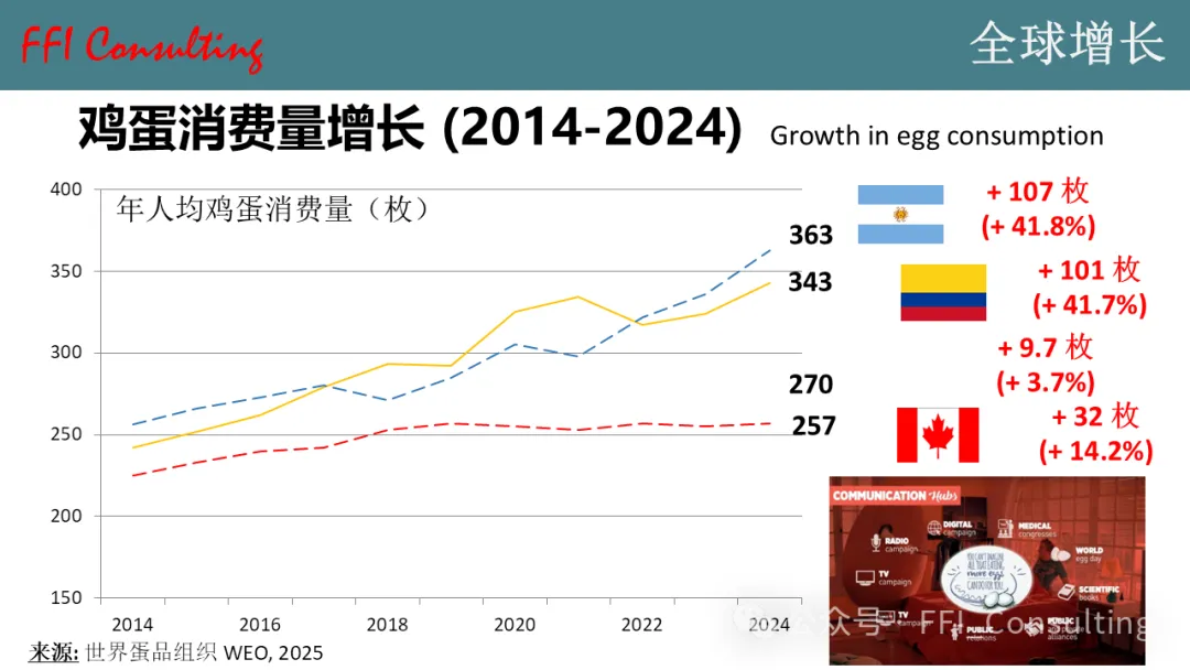 在那些投资于消费者意识宣传活动的国家,鸡蛋消费量正在迅速增长。通过综合策略,通常包括电视和广播广告、社交媒体宣传以及其他多种针对消费者的渠道,我们可以看到,即使消费者在禽肉、猪肉、牛肉或鱼肉方面拥有众多选择,这三个国家的鸡蛋需求依然增长。关键信息在于,在全国范围内开展广告宣传——所有鸡蛋生产商联合起来,共享资源——确实有效。我们有很多由实力雄厚、资金充足的全国性鸡蛋生产商协会推动的卓越增长案例。