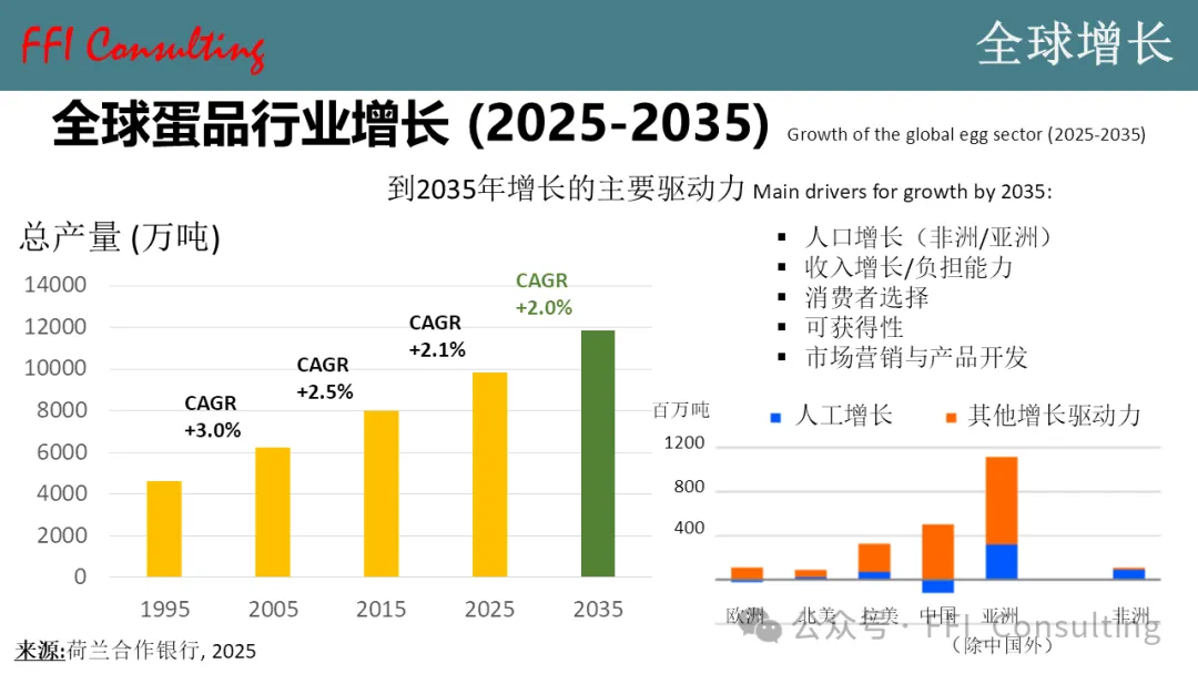 自1995年以来,全球鸡蛋行业一直保持着快速增长,最近几年(2015年至2025年)的年均增长率达到了2.1%。专注于农业领域的荷兰合作银行(Rabobank)预测,未来十年鸡蛋行业将继续保持每年2%的增长。虽然人口增长将是非洲和亚洲鸡蛋行业的主要驱动力,但我们知道中国、欧洲和北美的人口将会下降。鸡蛋行业的增长将主要来自消费者可支配收入的增加、对优质动物蛋白需求的增长,以及新产品和新理念的开发,从而为消费者提供更多食用鸡蛋的机会。