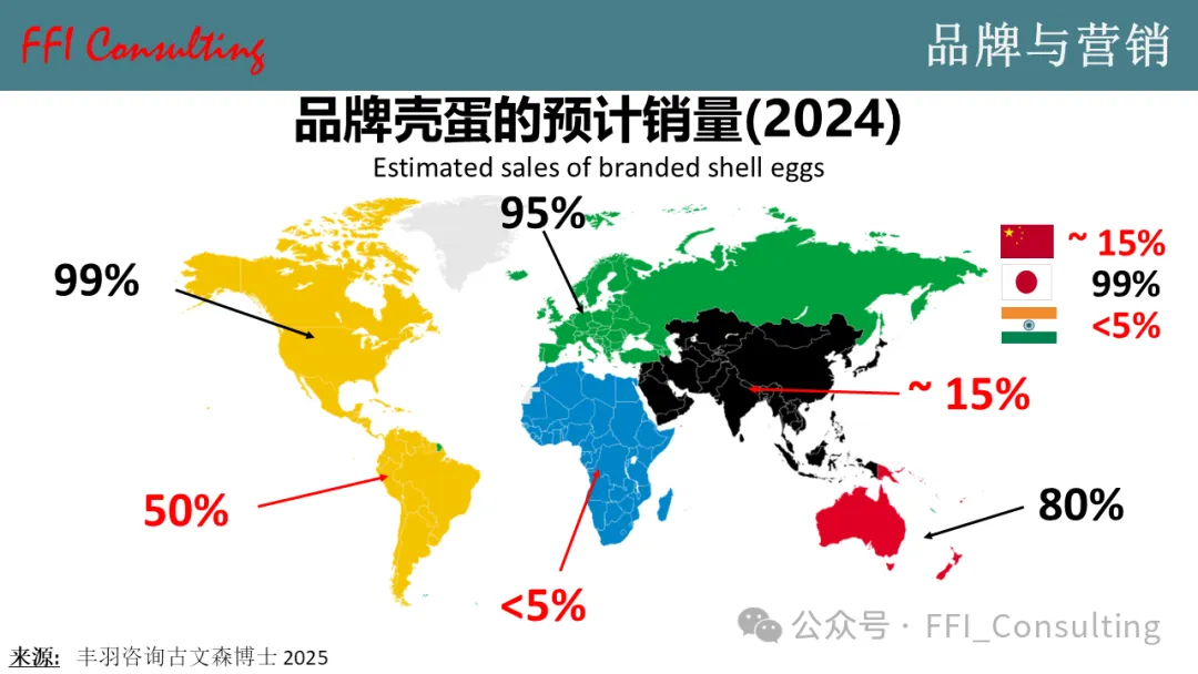 全球范围内,包装品牌鸡蛋的销售比例差异显著。北美和欧洲普遍销售品牌鸡蛋,而FFI咨询公司估计,拉丁美洲约有50%的鸡蛋是品牌鸡蛋,非洲则不到5%。亚洲各国的情况也大相径庭。在日本,所有鸡蛋都以品牌产品的形式销售,而在印度,品牌鸡蛋的销售比例不到5%。在中国,丰羽咨询公司估计品牌鸡蛋的销售额约占总销售额的15%,这意味着巨大的增长潜力。